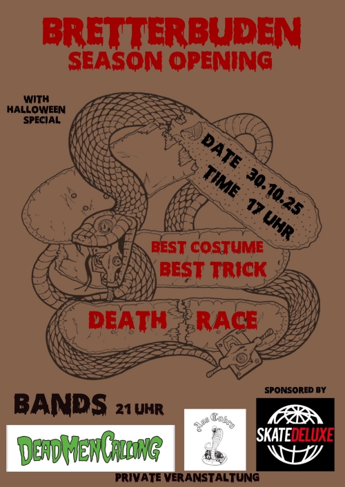 Am 30.10.2025 findet unsere diesjährige Halleneröffnung statt – und diesmal als Halloween Special! Start ist 17 Uhr. Es werden das beste Kostüm und der beste Trick gekürt. Außerdem wird es ein Death Race geben. Ab 21 Uhr wird es laut dank unserer Dudes von Dead Men Calling und Ass Cobra. Also kommt vorbei und startet mit uns in eine weitere legendäre Hallensaison!